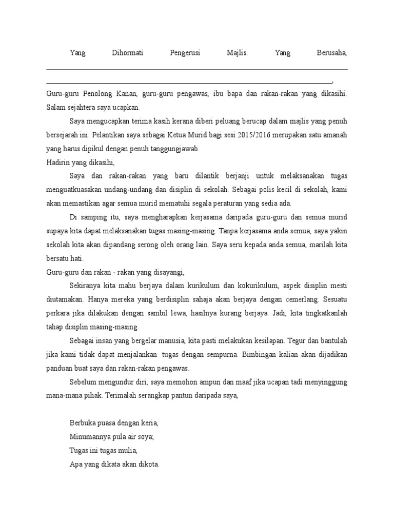 Bkm ucapan ketua pengawas sekolah sempena sambutan hari guru 2017. Para guru dan pelajar sekalian, seterusnya majlis menjemput perwakilan ketua pengawas selaku ketua murid smk demak baru mewakili para pelajar.iaitu saudara. Contoh ucapan hari lahir, hari jadi, takziah, guru, perkahwinan, perpisahan, penghargaan, tahniah, doa selepas solat. Perdana menteri malaysia sempena hari guru tahun 2011 may 13, 2011. Teks ucapan perasmian hari anugerah smkpbu.